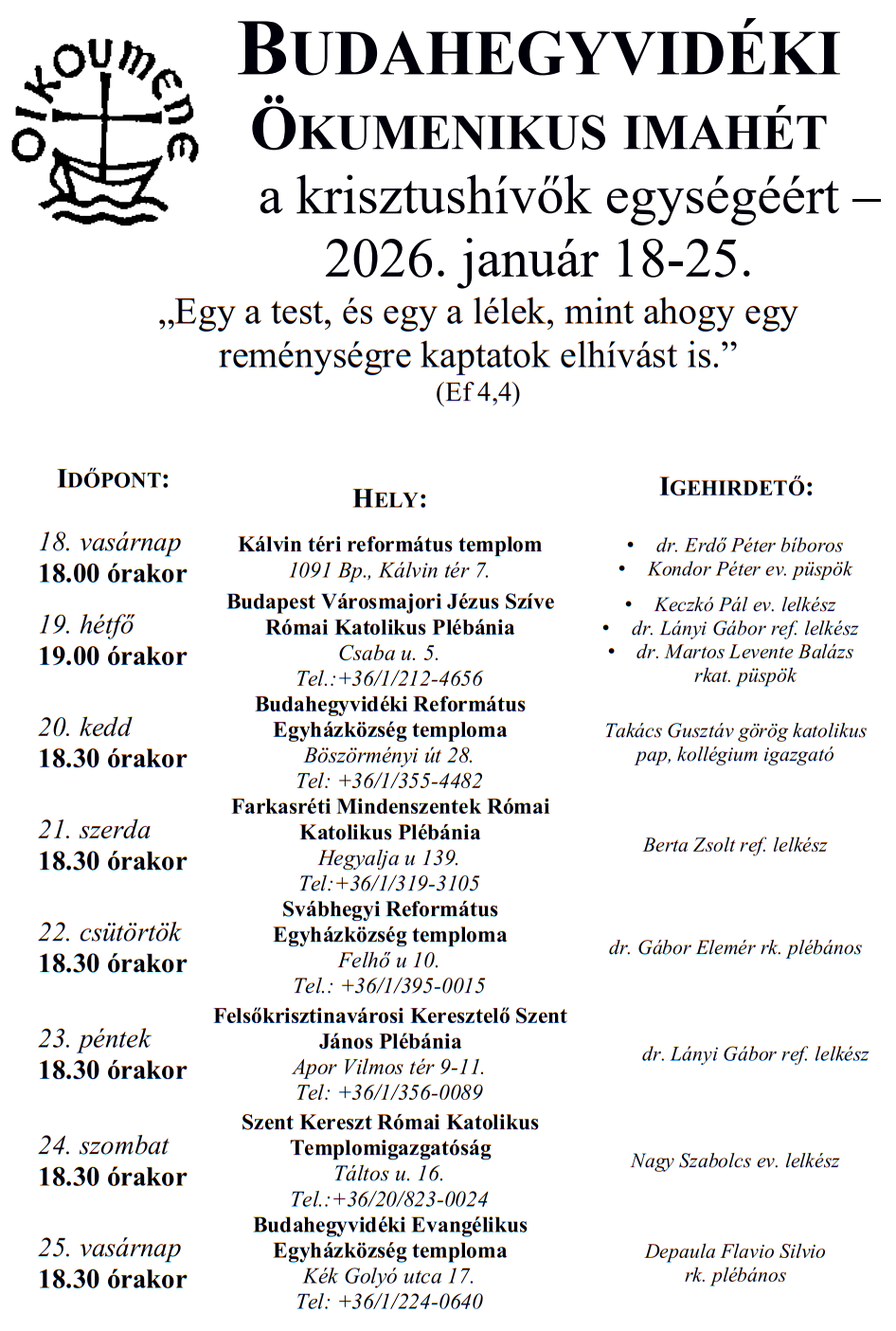 Az ökumenikus imahét január 18-25. között kerül megrendezésre. A közös imádságok rendje alább megtekinthető. (A képek kattintásra megnyílnak.)
