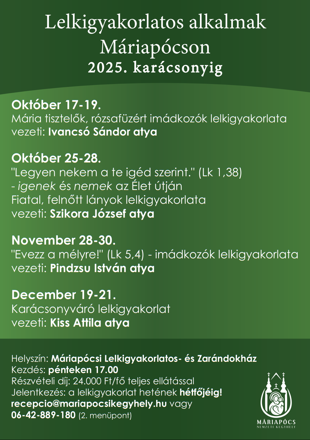 A Máriapócsi Lelkigyakorlatos Ház őszi és téli programjait ajánljuk mindenki figyelmébe. A programok plakátja itt található (kattintásra megnyílik):